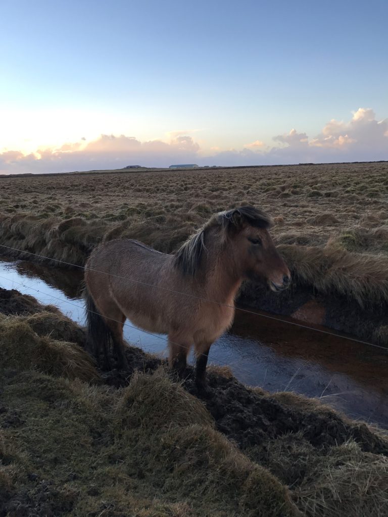 Bleikálótt hryssa í óskilum við Fákshóla/Berustaði/Ásmundarstaði. Er milli skurða og girðingar.