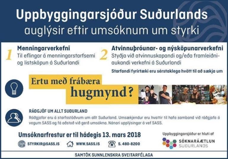 Sjóðurinn hefur það hlutverk að veita verkefnastyrki á sviði nýsköpunar og menningar á Suðurlandi.